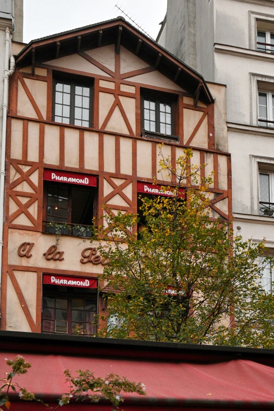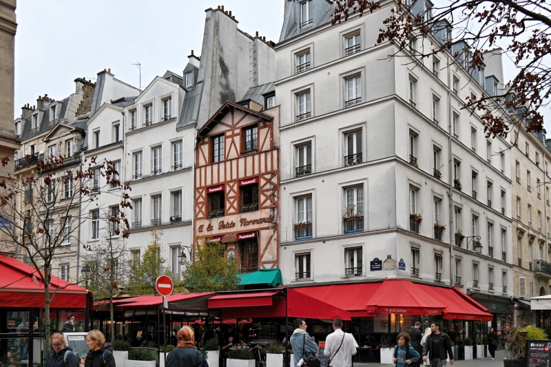 Le Petit Pharamond najdete v Les Halles jednoduše – mezi všemi těmi šedými pařížskými činžáky vás upoutá svojí historickou normandskou fasádou s červeným hrázděním a nápisem „Á la petite Normande“.