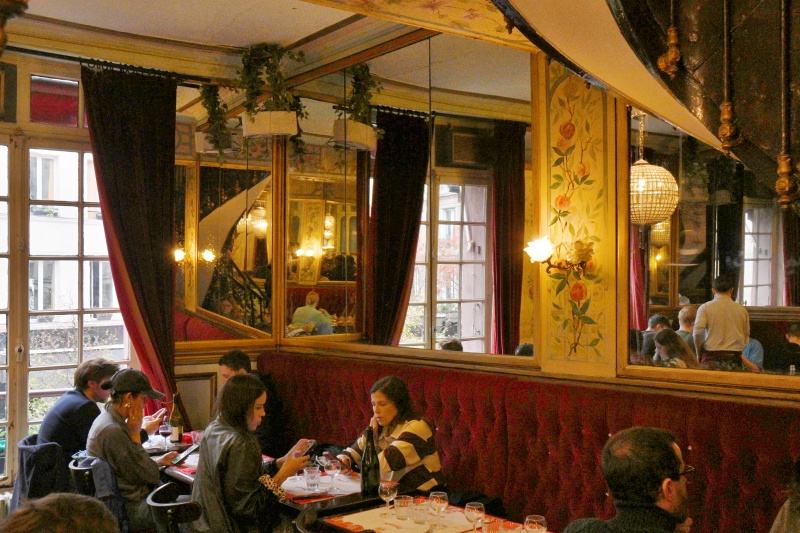 V rue du Trésor sice leží několik bister a kaváren, ze kterých stojí za zdůraznění hlavně Les Philosophes hned na rohu uličky, ale přesto vás chci upozornit ještě na další dvě. Hned za rohem v rue Vieille du Temple leží naproti sobě dva autentické podniky, které pamatují Paříž dávných let. Ta se zelenými výlohami se jmenuje Au petit fer à cheval. Důvod názvu je jasný na první pohled – je to kvůli jeho barovému pultu ve tvaru podkovy. Historické bistro má kromě starého zinkového baru i další zachovalé původní vybavení – mozaikovou podlahu, barové židle, potažené červenou koženkou, secesní lustr, nádražní hodiny ve výšce nad pultem, telefon z 50. let a baterii lahví s nejrůznějším alkoholem. Podnik pro sotva dvacet lidí nabízí jednoduchou a typickou francouzskou kuchyni, od cibulačky až po konfitovanou kachnu.
