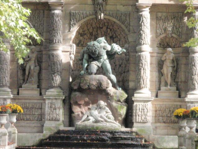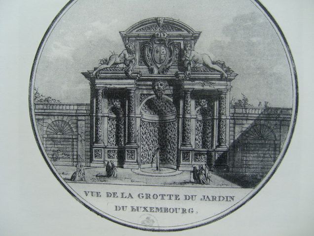 V roce 1630 požádala florentského architekta Tommasa Franciniho, aby jí v zahradě vytvořil tehdy módní grottu – umělou jeskyni. Tak vznikla 12 metrů široká a 14 metrů vysoká umělá zeď, jejímž úkolem bylo, kromě jiného, rovněž maskovat přilehlou Rue d´Enfer – Pekelnou ulici, která svému názvu nezůstávala nic dlužná. Zeď byla rozdělena čtyřmi zdobenými toskánskými sloupy do tří výklenků. Byla korunována ohromným frontonem, na kterém se nacházel štít, nesoucí erby Francie a rodu Medicejských. Vedle něj dvě alegorické ležící postavy, jejichž vytvoření královna zadala francouzskému sochaři Pierru Biardovi, představovaly řeky Rhônu a Seinu. Po obou stranách jeskyně se táhla kamenná zídka s falešnými arkádami.