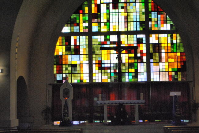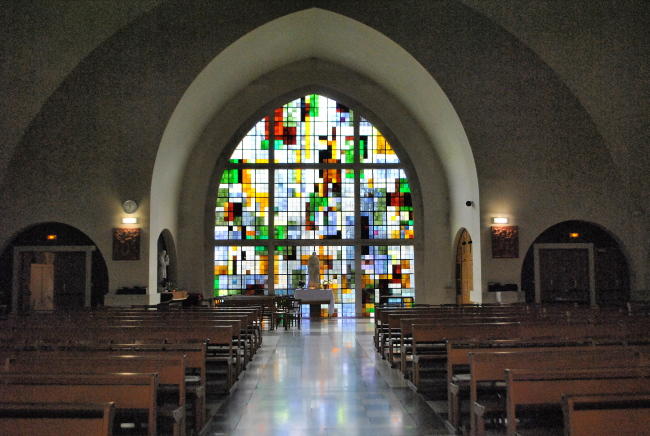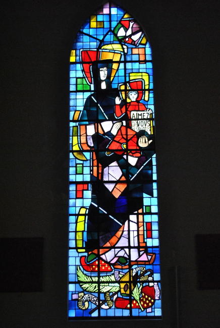 Vitrážová okna pocházejí z roku 1962 a vytvořil je P. Peugniez
