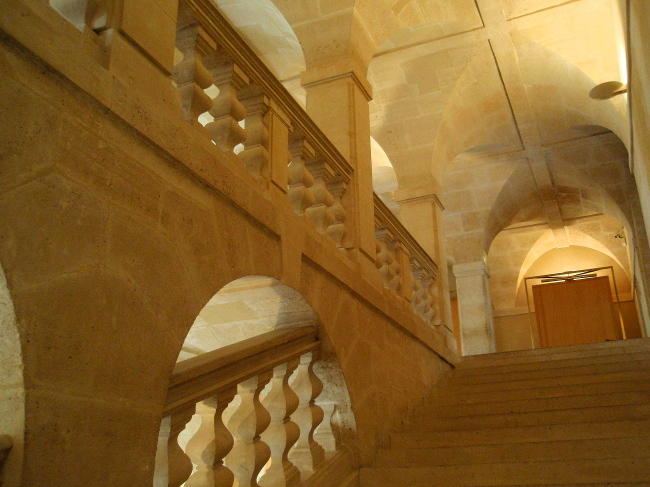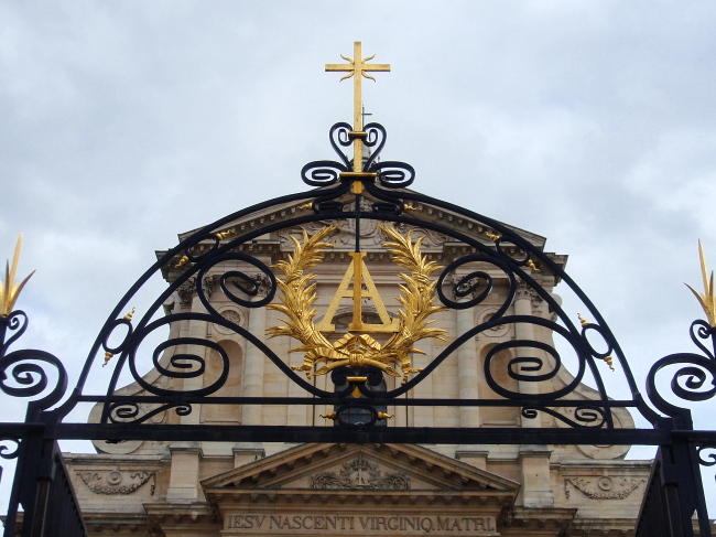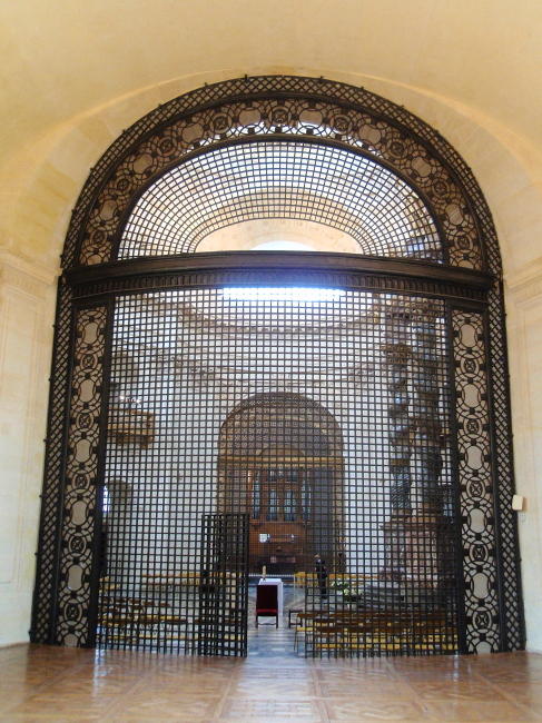 Ohromnou bránu v prvním patře vytvořil v roce 1664 Jacques Caquelart. Původně jí vévodila bourbonská lilie a písmena A a L jako iniciály královny a krále, to vše ale bylo odstraněno v době Francouzské revoluce, jako většina připomínek krále a království. Brána vede do kostela, kam se podíváme příště.