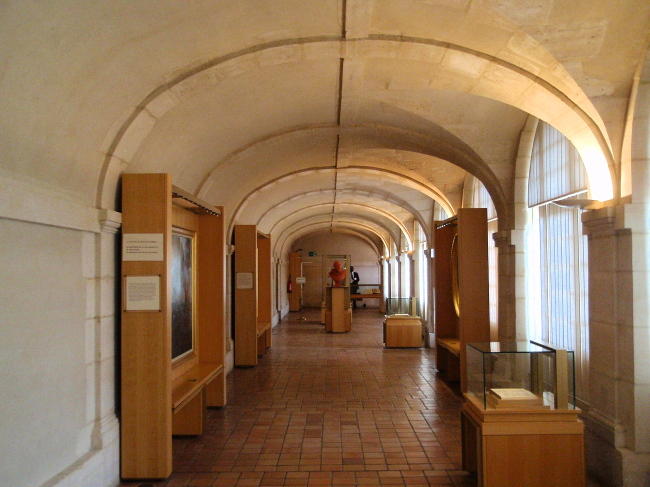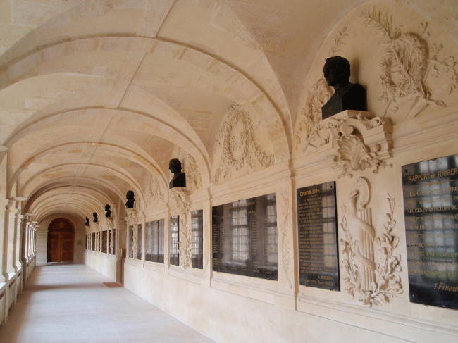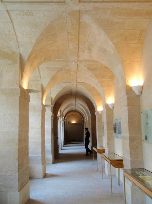 Arkády kolem dvora jsou sice kryté, ale okny je vidět ven na ohromnou barokní kopuli kostela, na nádvoří a do francouzské zahrady.