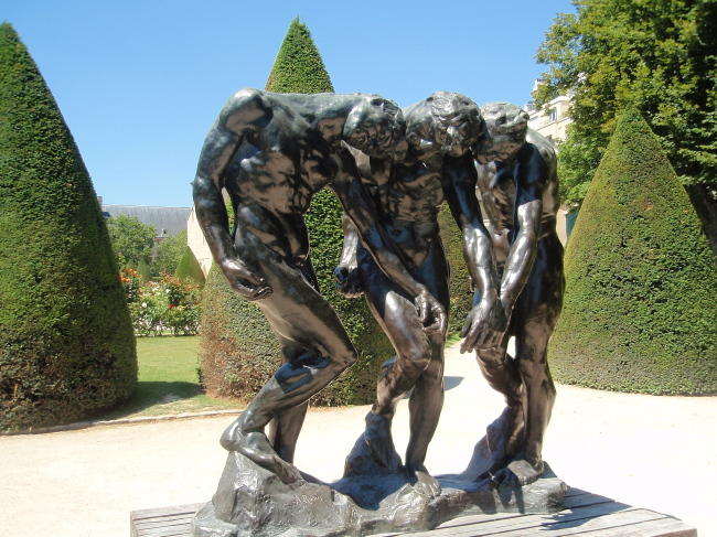 Sousoší Občané z Calais, možná Rodinovo nejslavnější dílo, je inspirováno příhodou ze Stoleté války, kdy se po jedenácti měsících blokády města Calais, obsazeného anglickými vojsky, šest občanů nabídlo jako rukojmí, aby město bylo osvobozeno. Tady jsou znázorněni v okamžiku, kdy se vydávají na smrt (to ještě netušili, že manželku anglického krále Eduarda III., původem Francouzku, dojme jejich čin tak, že si vyprosí jejich osvobození).
