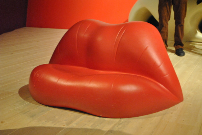 Samozřejmě nechyběla ani slavná pohovka ve tvaru rtů herečky Mae West. Ta byla také součástí instalace se jménem herečky, snímané kamerou, kde se každý mohl posadit a stát se tak součástí obrazu. Nešla jsem na to tak přímočaře – to uprostřed u pohovky nejsem já. Fotografku hledejte jinde.