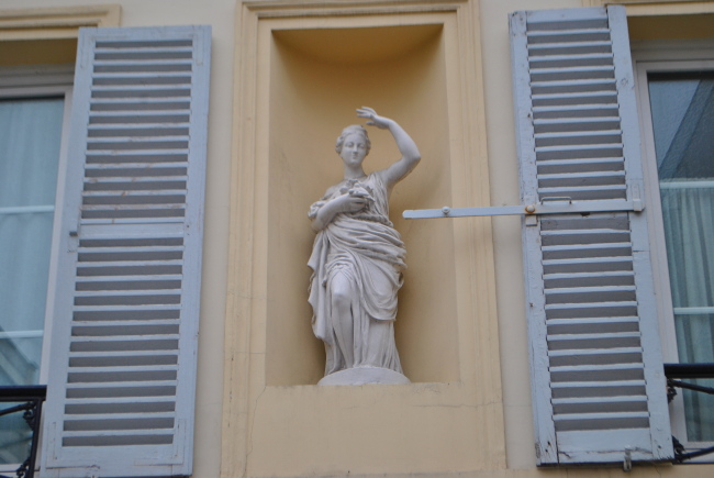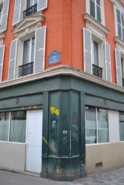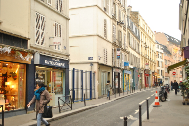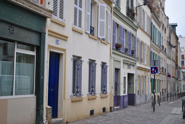 Za chvíli dojdeme do rue des Solitaires, další z prastarých bellevilleských ulic, která je zanesena už na starém plánu z roku 1730. Tvoří ji z jedné strany částečně staré nízké domky – a také tyto krásné domy, s barevnými okenicemi a replikou antické sošky ve výklenku v prvním patře, postavené kolem roku 1910.