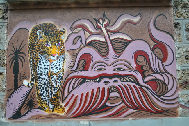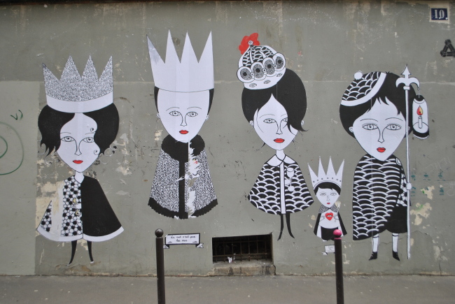 Na rohu bočních uliček najdeme také některé příklady street artu – jejich autorem je tady umělec, který si říká Fred Le Chevalier, zatímco dole vidíme žirafu známého malíře s přezdívkou Mosko.