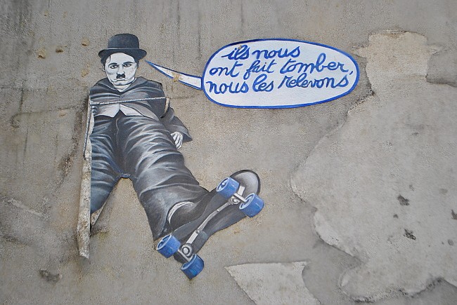 Na jedné ze slepých zdí v dolní části parku najdeme koláže Charlieho Chaplina a Harolda Lloyda, které vytvořil Jean-Marc Paumier (jeho stránky TADY). Jeho dalšího podobného díla z této americké filmové série jste si možná všimli na place des Abbesses v parčíku nad zdí s mnohojazyčnými nápisy „Miluji tě“