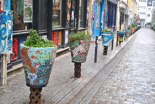 Proměnou prošly i obyčejné betonové květináče, které se proměnily na pestré mozaiky
