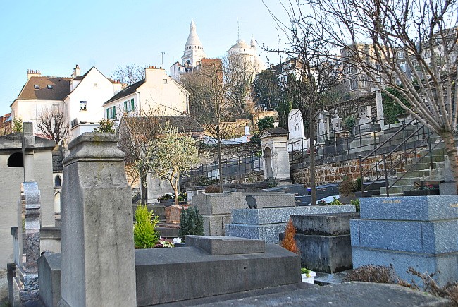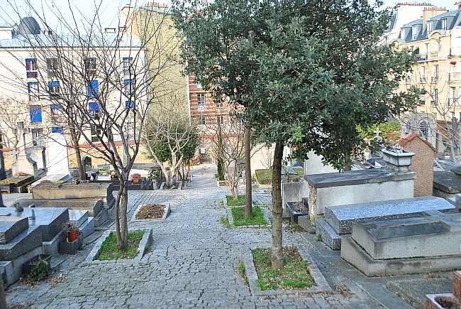 Hřbitov svým zadním cípem dosahuje až ke křižovatce, na které leží známý kabaret Lapin agile, kam chodívalo mnoho z těch, kteří tu teď za zdí odpočívají.