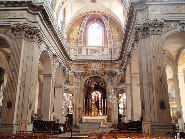 Po francouzské revoluci byl kostel vypleněn, mobiliář zničen a relikvie a sochy rozkradeny a rozbity, s výjimkou sv. Geneviève a Panny Marie, které byla přeměněny na sochy Rovnosti a Volnosti (docela by mě zajímalo, kdo ze svatých představoval Bratrství). Z kostela se stalo skladiště knih, které bylo později prodáno soukromé osobě, díky níž se v něm mohly konat tajné mše. Znovu byl oficiálně vysvěcen až v roce 1802. Jeho vnitřní vybavení včetně vitráží tedy pochází hlavně až z následujících let, stejně jako většina uměleckých děl.