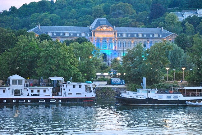 Pohled na průčelí muzea z mostu Pont de Sèvres. To večerní nasvícení působí docela psychedelicky.