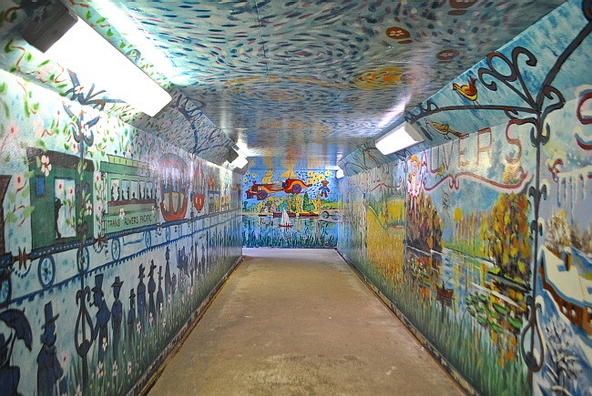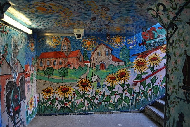 Podchod nás vítá jásavými barvami fresky, kterou tady v roce 2008 vytvořil malíř François Laval, který má ateliér těsně u nádraží. Na zdech vidíme památky městečka, okolní krajinu, květiny, vlaky i malíře, stojící v polích u stojanu. Kýč? Možná, ale pořád lepší než ukoptěné, temné a nebezpečné podchody na většině českých nádraží.