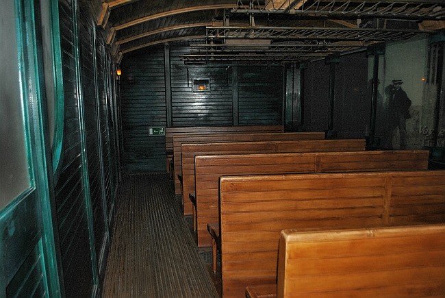 Výstava nás potom žene do podzemí – a tam, kde byste v běžné kavárně čekali toalety, se najednou ocitnete na cestě na nádraží