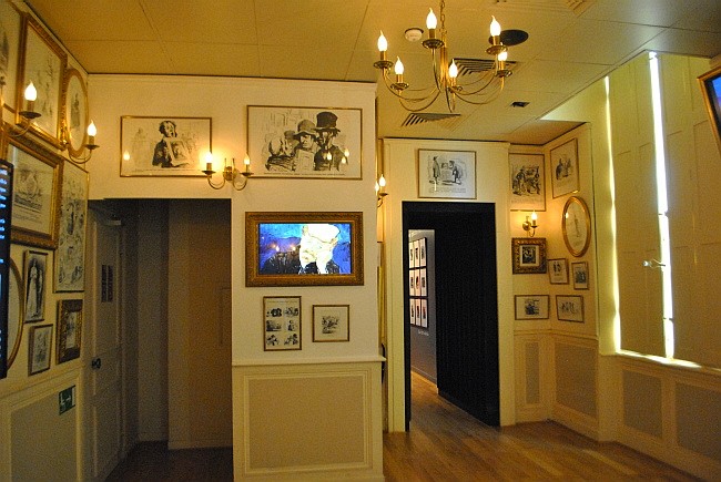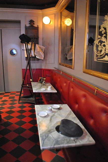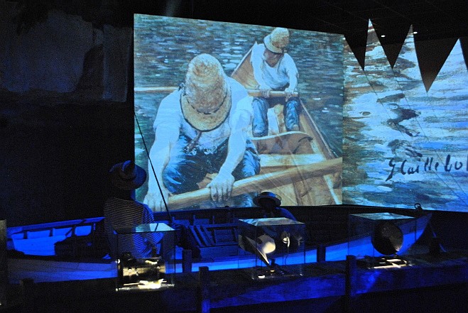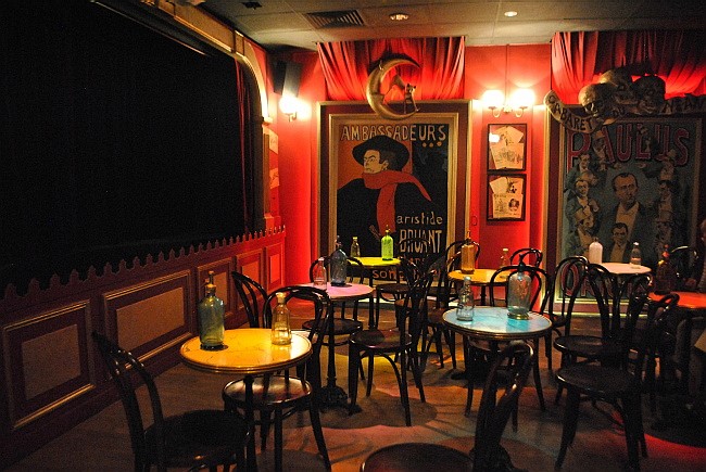 Další záležitost, charakterizující dobu impresionismu, jsou kabarety a tančírny. Nechybí ani Aristide Bruant na svém nejslavnějším plakátu. I tady, stejně jako v ostatních expozicích, se v okamžiku, kdy někdo vstoupí dovnitř, aktivuje multimediální program – někde je to povídání, historické poznámky, někde písničky, obrazy a kresby, jinde zase promítání – a tady je to film a kankánem, který se promítá na plátno na jevišti vlevo.