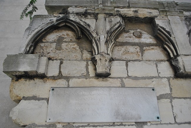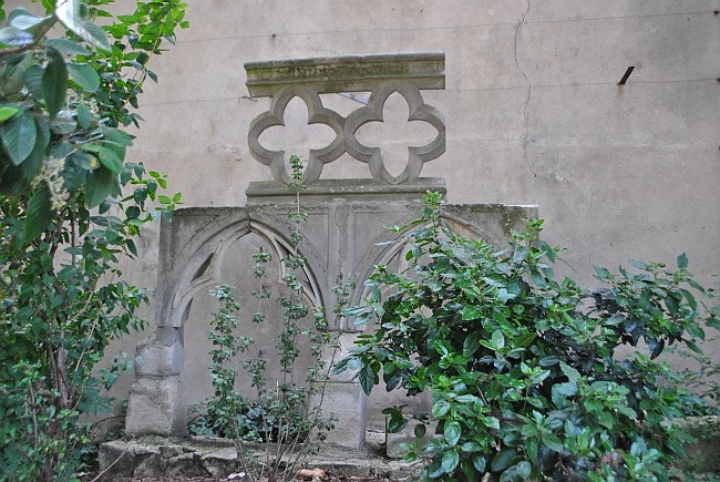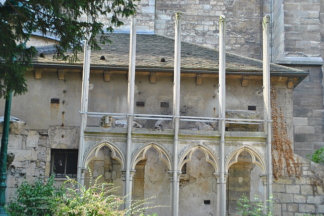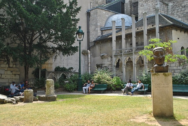 Věž kostela Saint-Germain des Prés se tyčí nad malým parčíkem, tvořícím náměstíčko square Laurent Prache. To přiléhá ke kostelu zhruba v místě, kde podle plánku opatství, který jsme tady viděli minule, býval klášterní rajský dvůr. O parčíku jsem tady už jednou psala ve spojitosti s Picassovou bustou, která sem byla umístěná na počest básníka Apollinaira, ale která představuje Picassovu milenku fotografku Doru Maar (se kterou bydlel v ateliéru v nedaleko odtud). My se dnes do parku podíváme z jiného důvodu, jsou tu totiž umístěny fragmenty zdiva z opatství i z kaple Panny Marie, která bývala také součástí opatství.