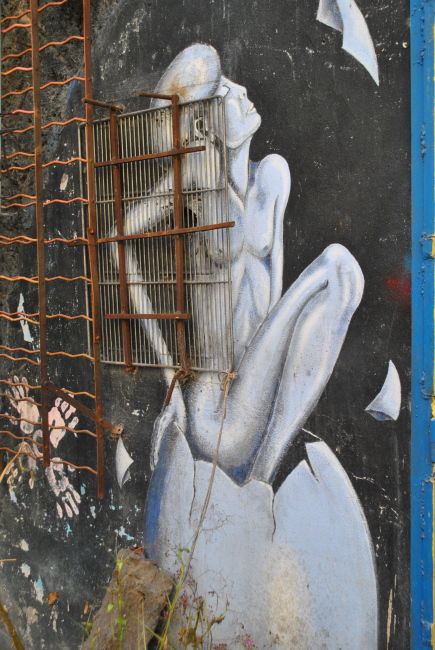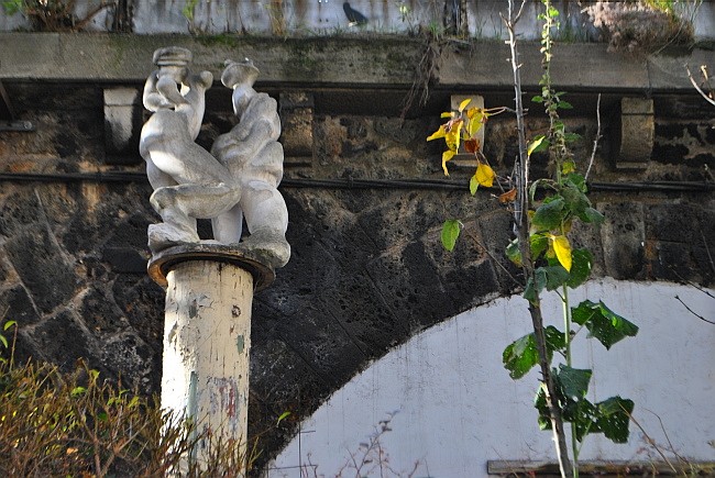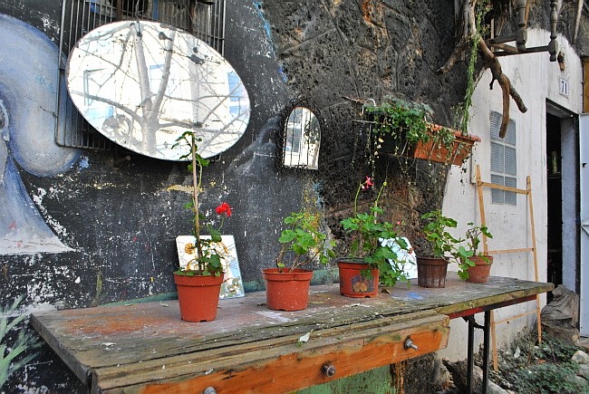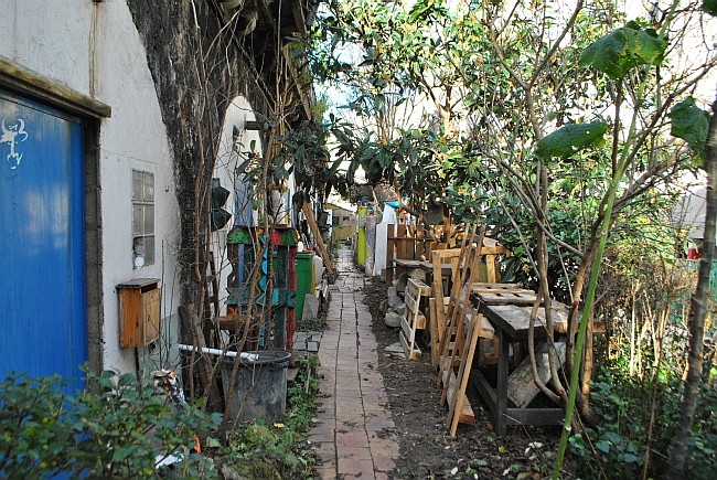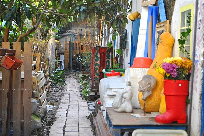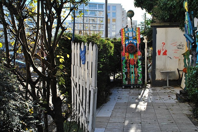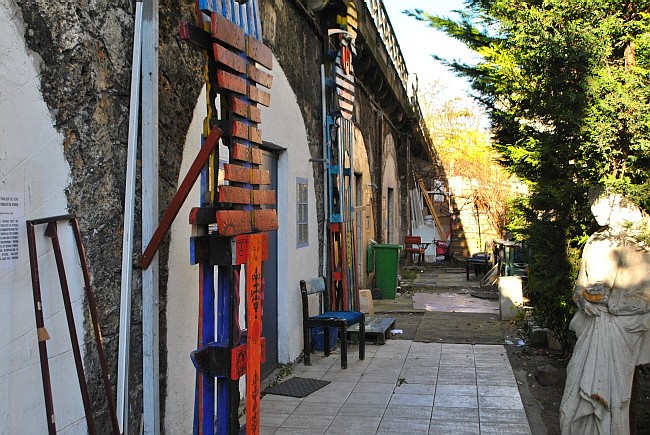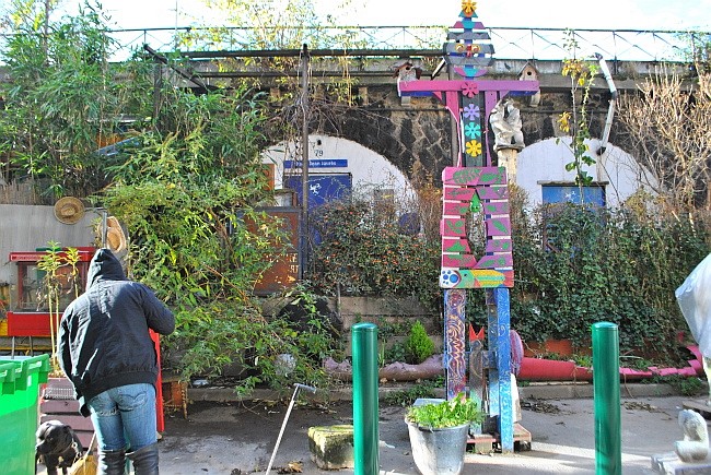 Podél viaduktu se táhne plotem ohrazený pruh, ve kterém si umělci zařídili zahrádky. Kromě vzrostlých stromků v nich najdeme samozřejmě i spoustu uměleckých děl i obyčejného haraburdí – od soch, vysokých barevných totemů z dřevěných palet, starého nábytku, květin až po těžko identifikovatelné předměty z nejrůznějších materiálů. Nechybí ani nápisy na zdech a streetart. Tak dlouho jsme kolem okouněly a fotily, až nás pozvali dovnitř.