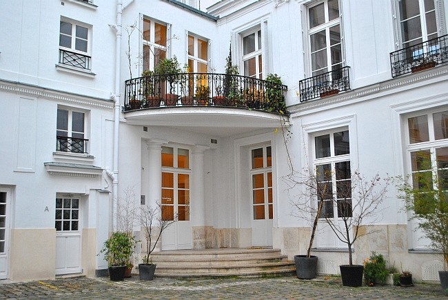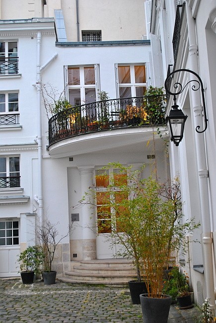 Ty dvorky jsou vlastně dva – na tom prvním malém najdeme hezkou fontánu s typickým pařížským „mřížovím“ (nevím, jak to nazvat jinak) na zdi
