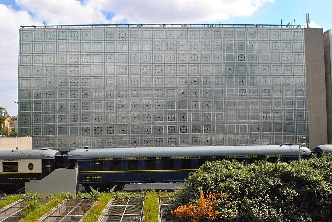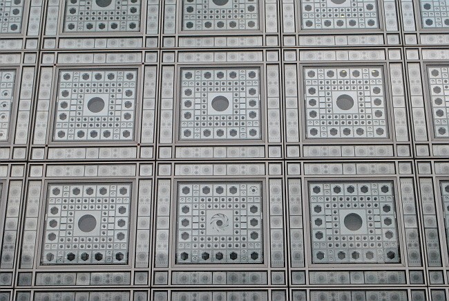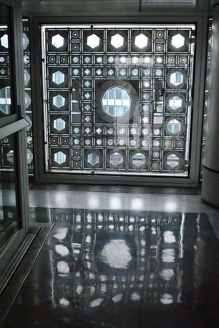 O nezvyklé fasádě, kterou Jean Nouvel navrhl ve tvaru arabských okenic – mušarabií, jsem tady už psala už několikrát. Okna jsou opatřena složitým systémem, složeným z lamel, uspořádaných kolem středových kruhových otvorů každého čtverce, který má podle intenzity světla automaticky nastavovat velikost otvoru. Bohužel je systém natolik komplikovaný, že už dávno nefunguje a otvory zůstávají, až na výjimky, otevřeny na maximum.