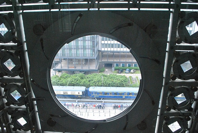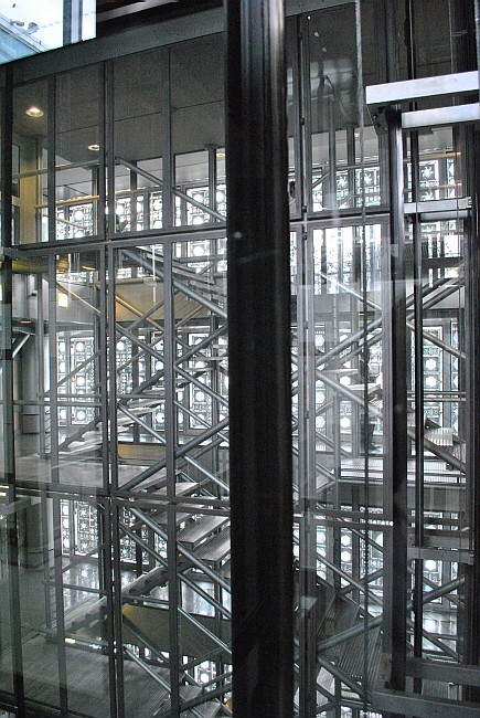 Z proskleného výtahu je zajímavý průhled budovou, při kterém odhalíme všechny její nerezové a skleněné vnitřnosti. Po vystoupení z výtahu můžeme také podrobně zkoumat mechanismus oken (mě osobně fascinují a strávila jsem tam spoustu času).