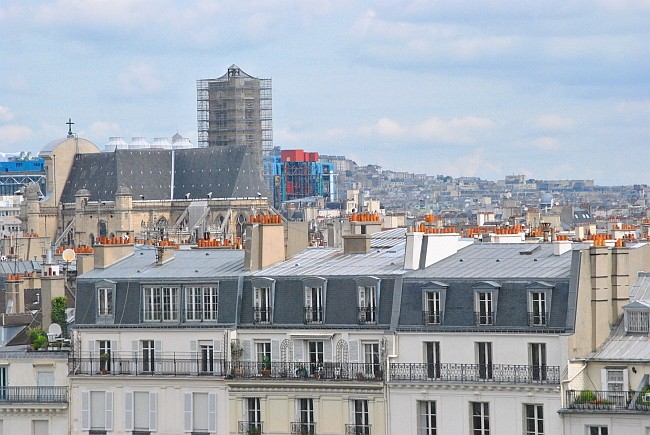 Nad střechami protějšího nábřeží vidíme za lešením na kostele St. Merri barevnou změť trubek Centre Pompidou. To nám zakrývá Montmartre, k jehož vrcholku se zvedají domy na obzoru po pravé straně.