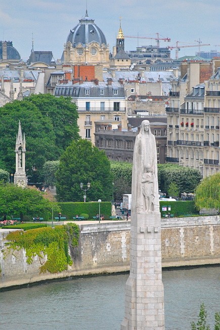 Sainte-Genevieve v popředí, za ní opět v parku novogotická fontána se sochou Panny Marie, o kousek dál Obchodní soud a Conciergerie. Vlevo od ní mezi střechami úzká ostrá špička Sainte-Chapelle.