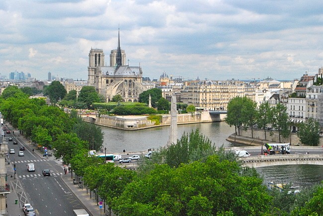 Úplně nejblíž k nám vidíme na mostě pont de Tournelle sochu sv. Genevieve, za ní v parčíku Square Jean XXIII bílou jehlu novogotické fontány, za Notre Dame vpravo potom úzkou zlatou špičku hodinové věže Conciergerie a těsně před ní kupoli Obchodního soudu. Po levé straně Notre Dame vykukuje růžek policejní prefektury a daleko za ní na obzoru věžáky v la Défense. Když se podíváme pozorně, uvidíme před nimi malý čtvereček Vítězného oblouku.