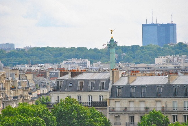 Zlatý Duch svobody na Červencovém sloupu na place de la Bastille a daleko vzadu (i když to tady tak daleko nevypadá) za 11. a 20. obvodem pařížská dvojčata Tours Mercuriales u Porte de Bagnolet.
