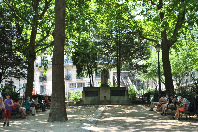 Po rue Caulaincourt se vydáme nahoru kolem kaváren, restaurací, bister a obchodů, kterých je tady plno, až dojdeme k malému parčíku na place Joël le Tac, ve kterém stojí kamenná socha vysokého muže