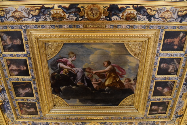 Malba uprostřed stropu představuje Marii Medicejskou, obnovující mír ve Francii
