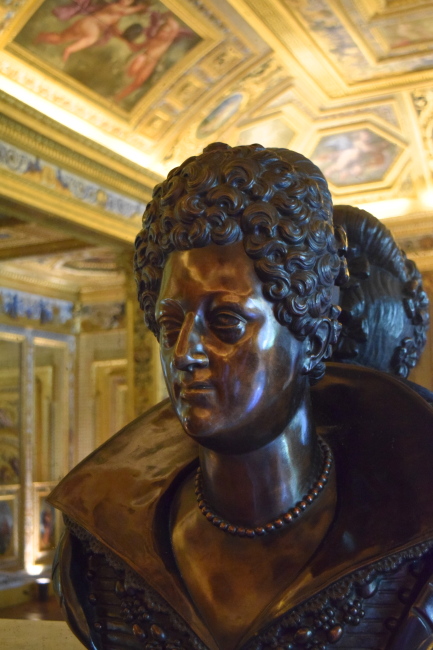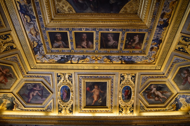 Pokoj v přízemí s výhledem do zahrady je bohužel temný (a nesmí se tady fotit s bleskem). Podobně tady prý vypadaly všechny pokoje (než nastoupila ruka revolucionáře). Výzdoba se zachovala také v kapli Marie Medicejské, do té jsme ovšem my nemohli, ale ve Dnech evropského dědictví prý bývá otevřená.