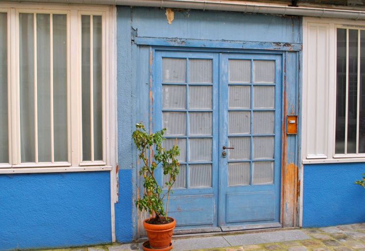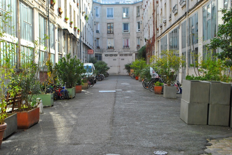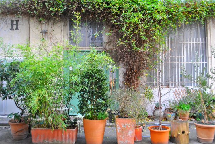 Ulice je samozřejmě také protkána pasážemi a dvory s dílnami a ateliéry. Některé jsou veřejně přístupné, do jiných se dostanete náhodou, když zrovna někdo nechá otevřeno. Všechny jsou půvabné, více či méně ošuntělé a můžete se vsadit, že jsem jich už prošla celou řadu. Ten největší a možná i nejhezčí obytný dvůr s názvem Cité du Figuier jsme už viděli před časem TADY, do dalšího se podíváme ještě příště. Dnes vejdeme do dvora domu číslo 160 v horní části ulice pod metrem Ménilmontant.
