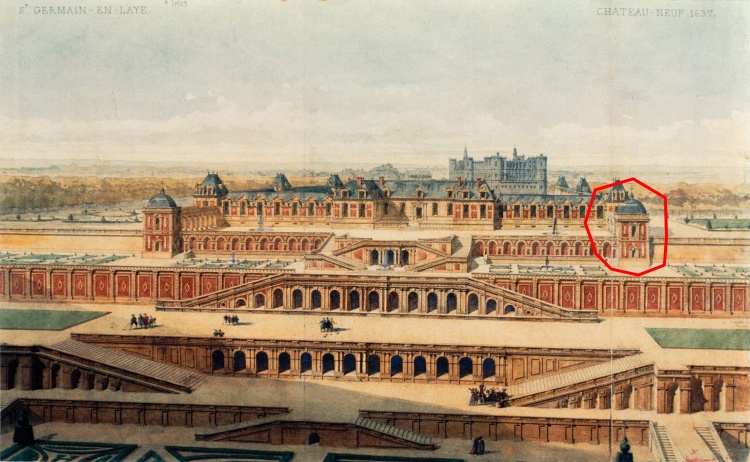 Když říkám, že z nového zámku nic nezůstalo, není to tak úplně pravda. Z celého rozsáhlého královského paláce zůstal zachovaný tzv. pavilon Jindřicha IV., malá červená stavbička, která ukončuje terasu na jižní straně. Na dolním obrázku je vidět, kde ležela v původní dispozici zámku.