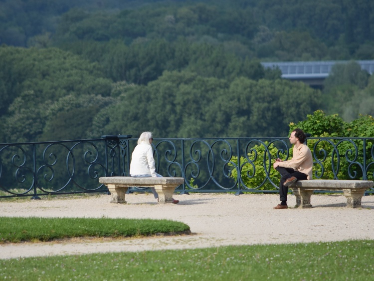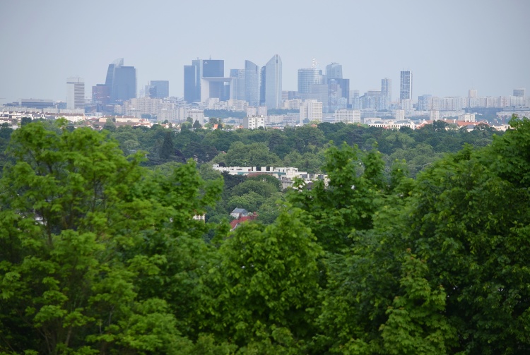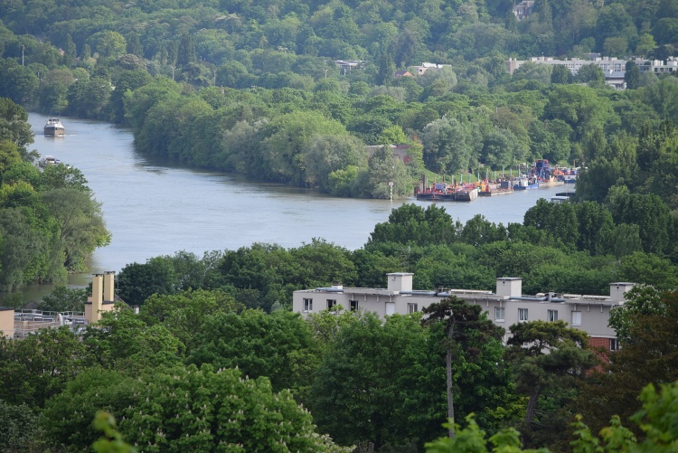 Prudký svah pod terasou vede k řece, která tady dokončuje jeden ze svých zákrutů, kterými se vzdaluje od Paříže. Je obklopená lesy a je plná hausbótů a člunů. Nad ní na obzoru vidíme v dálce věžáky La Défense a trochu víc vpravo vykukuje i Eiffelovka.