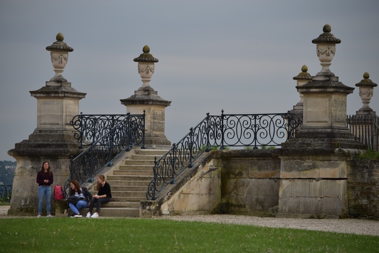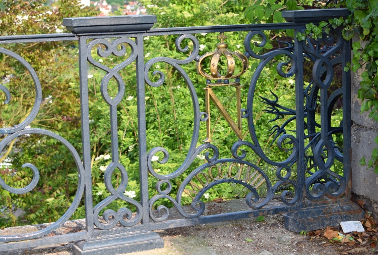 A ještě jedna připomínka jednoho vládce. Minule jsem psala, že rekonstrukci starého zámku nechal provést Napoleon III., synovec velkého Bonaparta, který byl současně císařem a také prvním francouzským prezidentem. Právě on tady nechal v roce 1857 vytvořit toto krásné zábradlí kolem terasy – a v místech, kde se zábradlí připojuje k pavilonu Jindřicha IV., najdeme jeho připomínku i s datem.