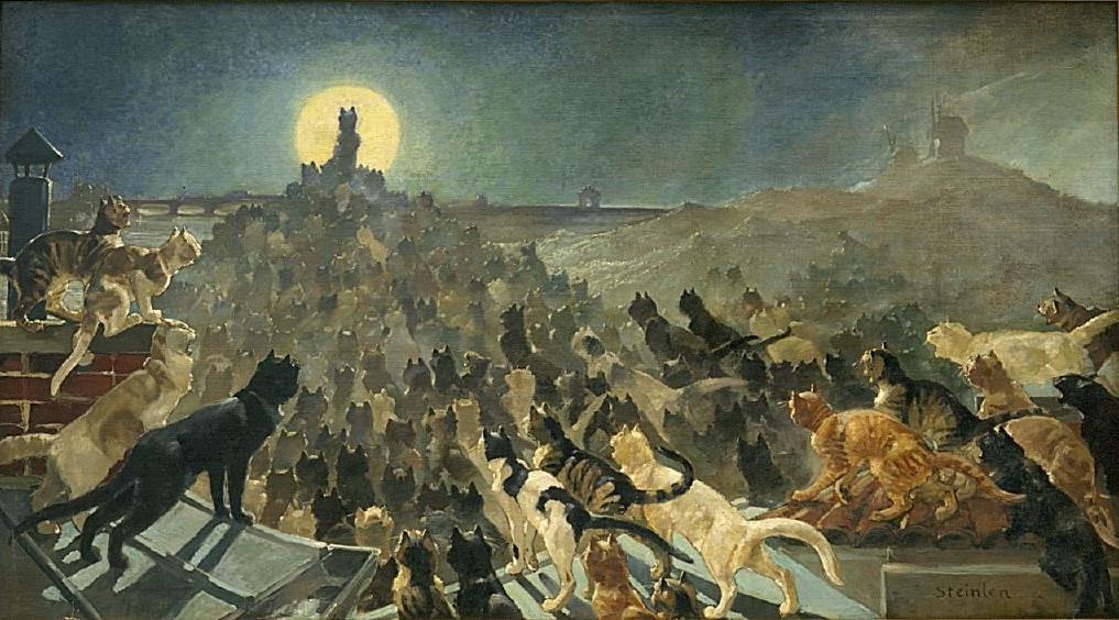 Najdeme tady také několik obrazů Théophila Steinlena, velkého milovníka koček (a autora známého vývěsního štítu kabaretu Chat noir), jak je vidět i z tohoto velkého plátna s názvem Apoteóza koček