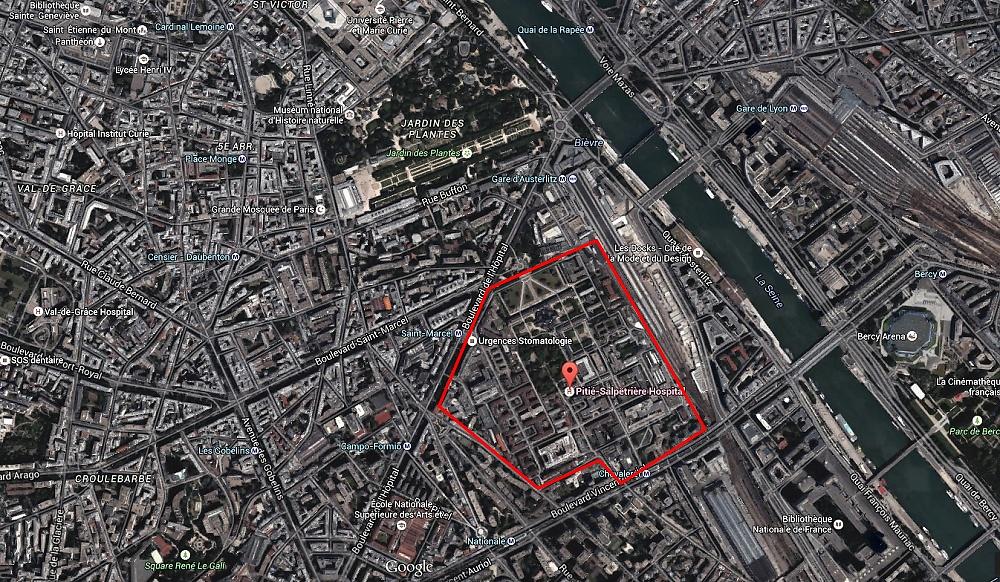 Průchody ve staré zdi se dostaneme do prostor dřívější nemocnice Pitié. Ta zde byla postavená na začátku 20. století poté, co její původní sídlo na místě dnešní Velké pařížské mešity bylo přeměněno na věznici a později zbouráno.
