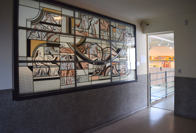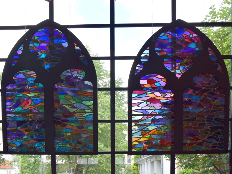 Barevná vitráž ve 2. patře představuje příběhy Psyché. Na výšku celé fasády běží další pruh černo-bílé vitráže se třemi tématy, vztahujícími se ke třem činnostem, které sklářský ateliér vykonával – vitráže (Chartres), mozaiky (Ravenna) a západní umění (bohyně Athéna). Byl to vlastně vývěsní štít celého ateliéru.
