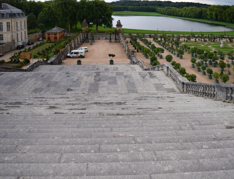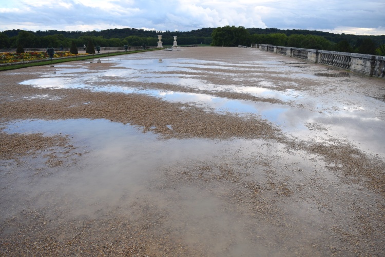 Jak je vidět při pohledu z terasy do parku, přelidněno tam zrovna nebylo. Nikdo nebyl ani v oranžerii. Tam mě taky zastihl druhý liják. Obloha najednou zčernala a to, co přišlo, mě promočilo až na kůži, ještě než jsem vyběhla schody zpátky na terasu a schovala se ve výklenku zámeckých dveří.