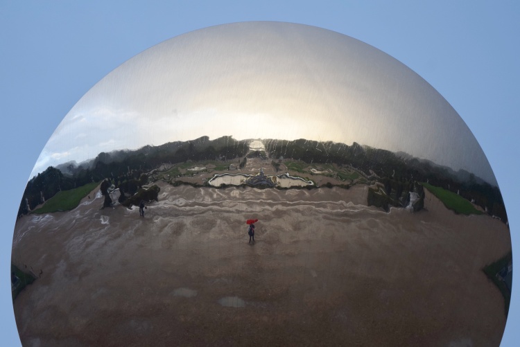 Na terase zámku jsem si znovu prohlédla obě Kappourova zrcadla a namířila si to do levé části terasy směrem k oranžerii. Po lijáku byly pískové cestičky plné louží, ale obloha byla jasná a pár turistů, kteří stejně jako já uvěřili, že se počasí umoudřilo a že už bude hezky, pokračovalo v prohlídce.