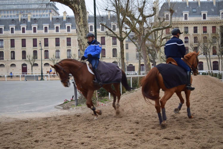 Za mohutnými vraty boulevardu Henri IV. se dostaneme okamžitě k tomu hlavnímu, co gardu odlišuje od ostatních jednotek – ke koním. Nádvoří komplexu je upraveno pro jejich trénink a je lemováno stájemi. Jednou z částí areálu je i velká krytá jízdárna (na spodní fotce ta budova v pozadí).