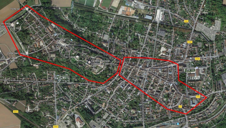 Letecký pohled na Provins. Vlevo hormí město, které jsme viděli minule, vpravo to dolní, kudy jsme chodili dnes. Na letecké fotce je hezky vidět obrys hradeb. Jejich zachovaná část je úplně vlevo; v ostatních částech, kde byly zbourány, dnes vede vodní kanál a alej.