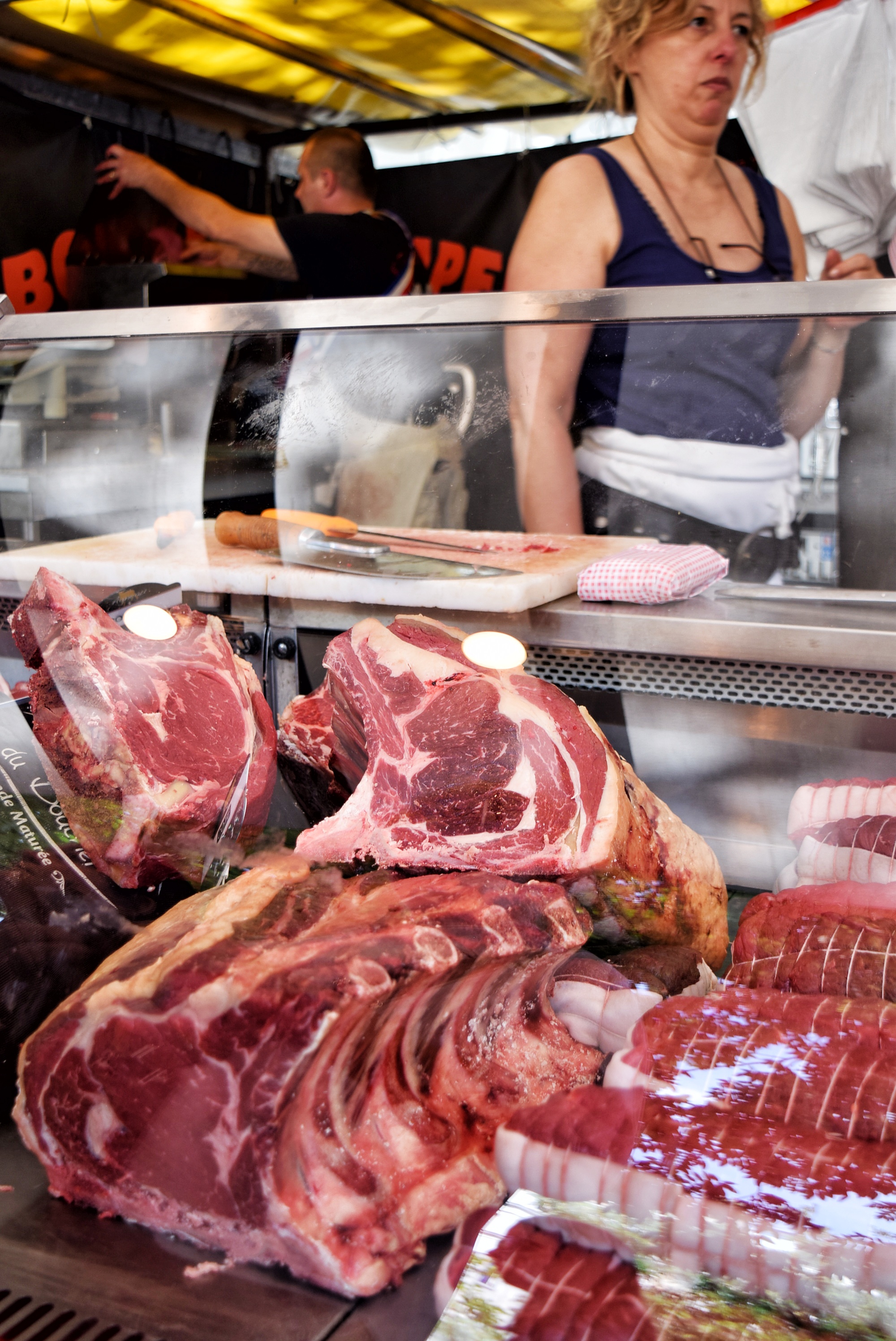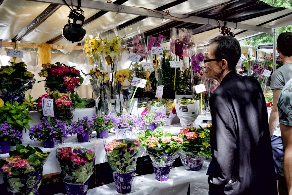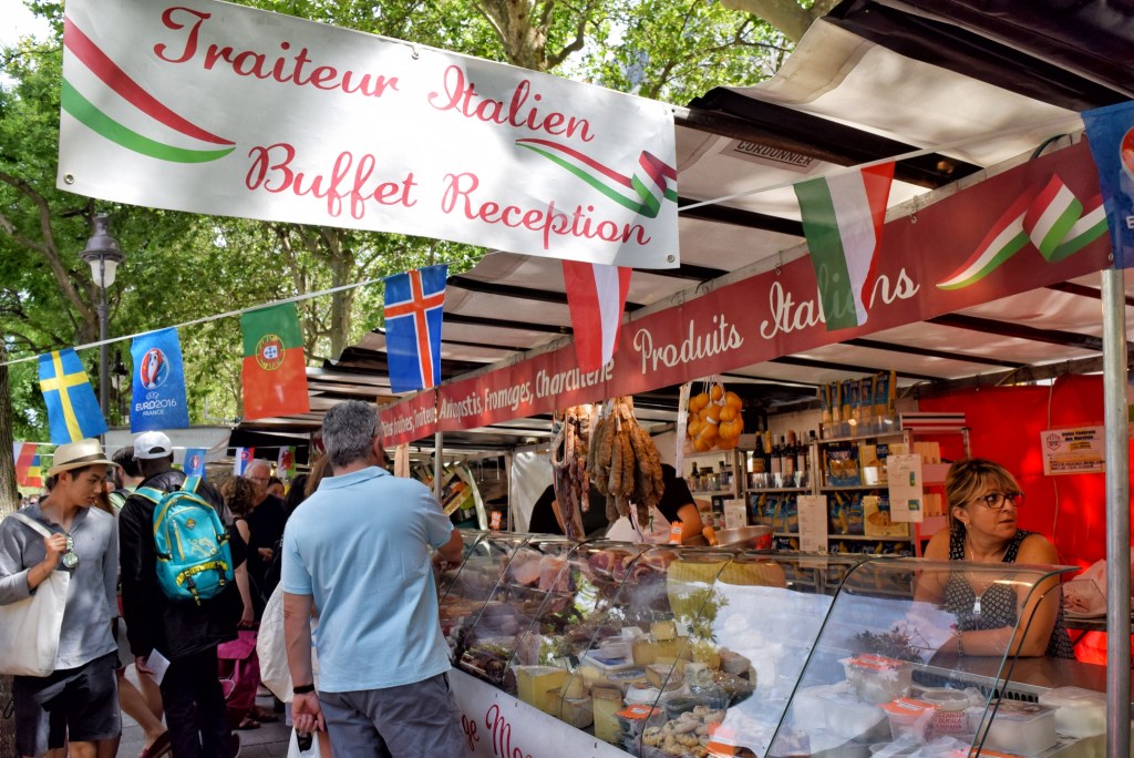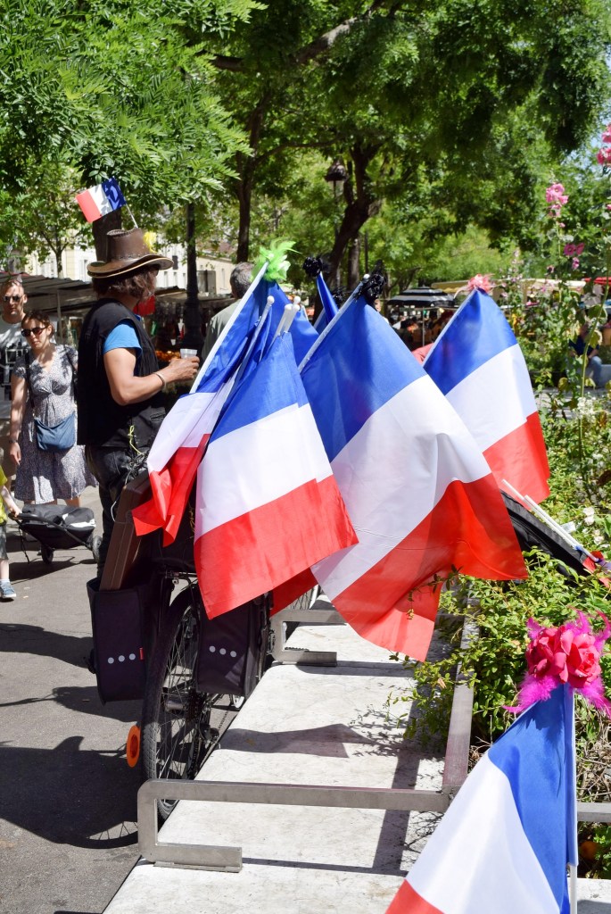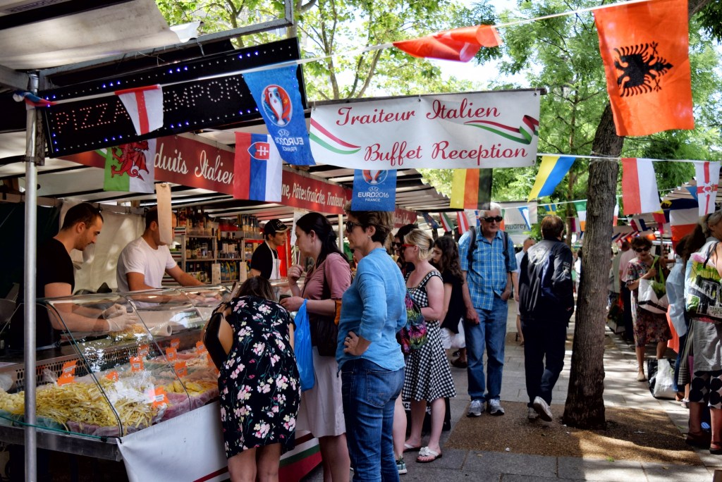 Fotografie nejsou z letošního léta, ale z července 2016. Byla to ta neděle, kdy se odpoledne hrálo v Paříži finále ve fotbalovém mistrovství Euro 2016, ve kterém se střetla Francie s Portugalskem (aby pak v prodloužení prohrála). Není proto divu, že na trhu bylo dopoledne k mání i trochu neobvyklé zboží, které tam běžně nebývá, a že byly stánky ověšené vlajkami.
