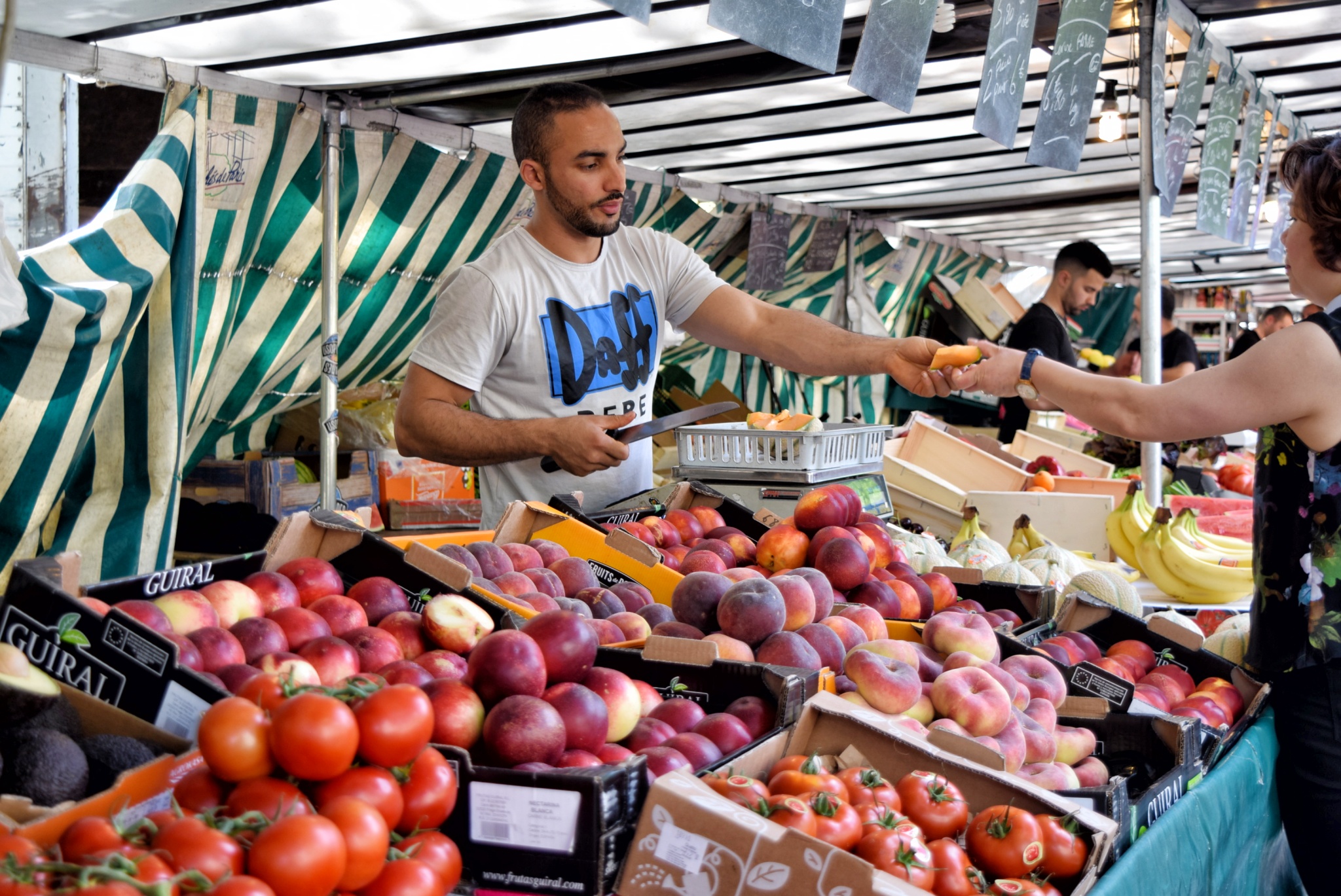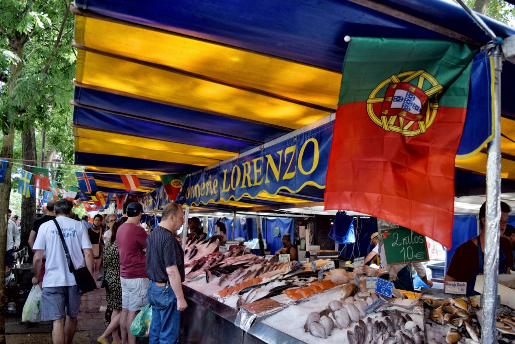 Neděle je v Paříži dnem, kdy lidé vyrážejí na trh na nákupy. Přes týden je čas sotva na to, koupit večer cestou domů z práce bagetu a něco k večeři, takže ty nejdůležitější nákupy potravin si často schovávají na neděli. Na nedělním trhu nakupují Francouzi nejen suroviny, ze kterých budou vařit nedělní oběd, ale často i u tak zvaných traiteurs, stánků s hotovými pokrmy, rovnou celé menu, které doma jen ohřejí. Ta spousta stánků s hotovými jídly prakticky z celé šíře mezinárodní gastronomie mě tam vždy fascinuje.