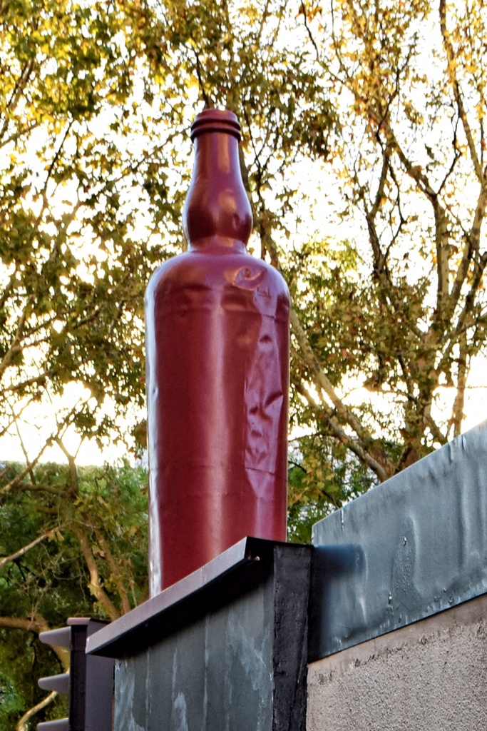 Ohromnou láhev umístili na střechu někdy v 50. letech jako reklamu na dnes už neexistující aperitiv Picon. Po zániku značky ji přemalovali na reklamu na Cassis a když už byla později hodně oprýskaná, dostala jednotný vínově červený nátěr. První obrázek je ze začátku 90. let (foto z internetu, autor je neznámý), druhý z roku 2018.