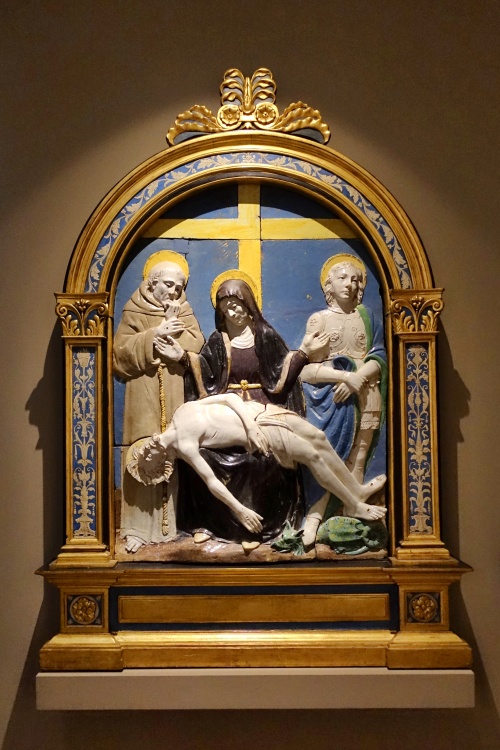 Za autora reliéfu z glazované keramiky byl dlouho považován italský sochař Andrea della Robbia – toto autorství však bylo pozdějšími analýzami zpochybněno. Jisté je, že pochází z Itálie z doby kolem roku 1520. Zhruba do stejného období spadá i gobelín na spodní fotce.