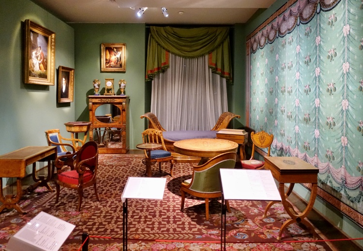 Také nábytek z další expozice má svoje přesné určení. Pochází z doby po roku 1815, kdy byla po Napoleonově porážce znovu instalována monarchie. Tak zvané období Restaurace sebou přineslo nejen Ludvíka XVIII., ale také zálibu v jednoduché módě. K tomu patřily také hladké křivky nábytku, světlé dřevo a zdobení intarziemi a bronzem. Nábytek na horním obrázku patřil vévodkyni de Berry, která v letech 1815 – 1830 obývala pavilon Marsan.