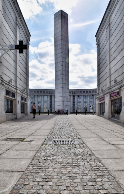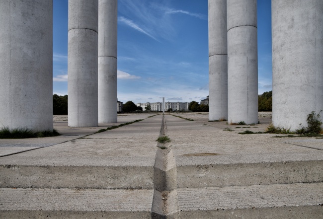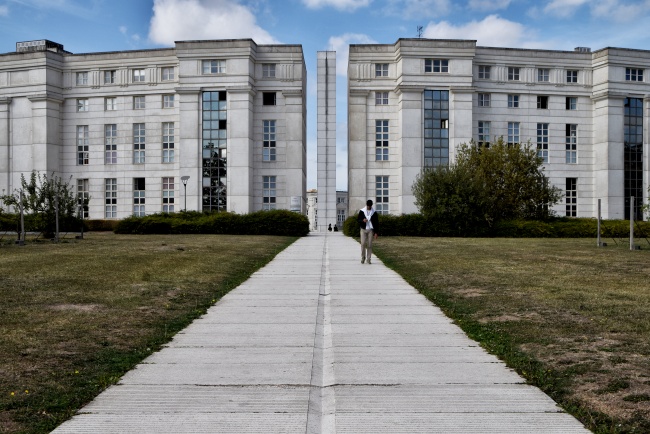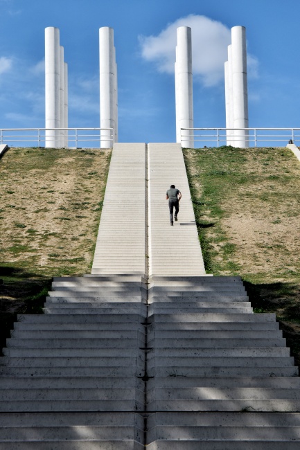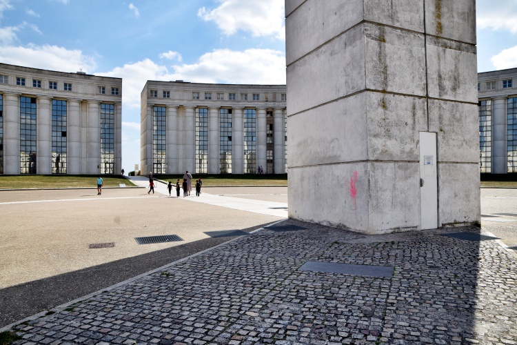 První residenční čtvrť s říčním přístavem byla tehdy postavena v Cergy kolem malého historického jádra s pár kamennými domy a kostelem Saint-Christophe z 12. století. V průběhu dalších tří desetiletí došlo k další mohutné výstavbě. Přibyly nejen pobočky pařížských universit a vědeckých ústavů, ale především čtyři zcela nové čtvrti. Zmíním se jen o dvou – nezajímavém sídlišti s ošklivou brutalistní budovou prefektury kraje Val d´Oise a o něco dál situované moderní čtvrti kolem stanice RER linky A Saint-Christophe. Právě tam na zastávce s ohromnými skleněnými hodinami nad vstupem vystoupíme a vydáme se mezi domy k obelisku, který vykukuje z dálky z náměstí place des Colonnes uprostřed Bofillova bytového komplexu.