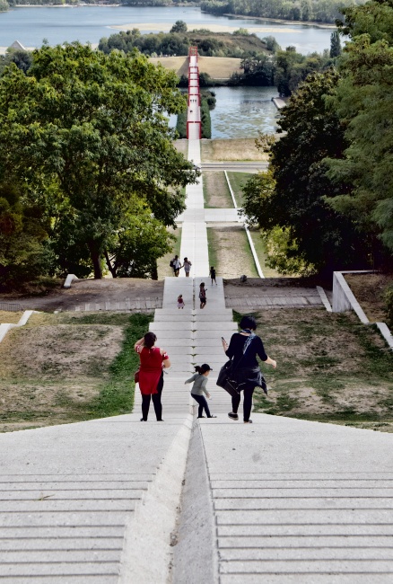 Schodiště nás přivede až na úpatí červeného mostu, ale než na něj vstoupíme, čekají nás ještě další dvě zastavení. Tím šestým je Amfiteátr Gérarda Philipa, situovaný přímo pod vstupem na most, a sedmým je vodní nádrž dlouhá šedesát osm metrů a hluboká metr dvacet, která amfiteátr obklopuje a je propojena přímo s řekou Oise. Zdá se to těžko uvěřitelné, ale do amfiteátru se údajně vejdou tři tisíce osob.