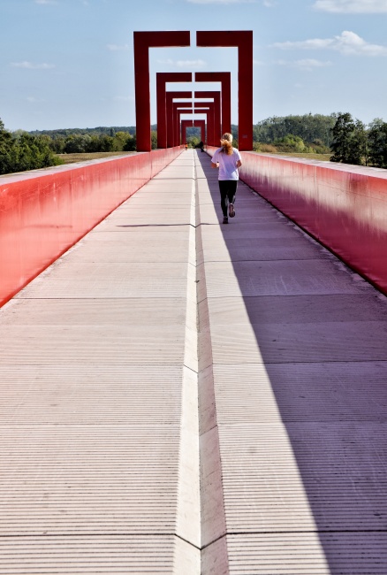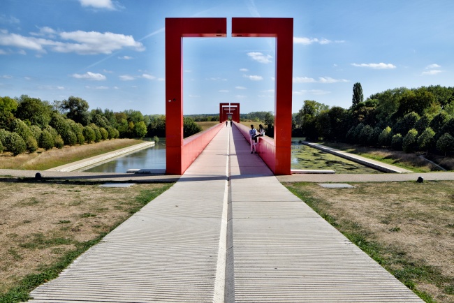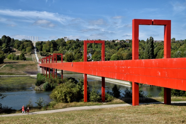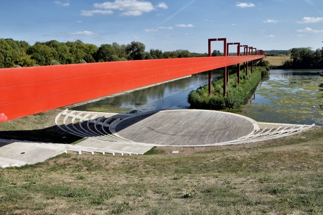 Červená lávka se klene nejen přes vodní nádrž, ale i přes řeku Oise. V celé své délce 251 metrů byla dokončena až v roce 2008. Stala se tak nejnápadnějším a přímo emblematickým symbolem celého tohoto díla. Po jejím překonání, kde nás stále doprovází betonový povrch s prohlubní uprostřed, se dostaneme na úzký pruh země mezi řekou a umělým jezerem. Z břehu můžeme vidět další zastavení, kterým je nedaleký kulatý umělý Astronomický ostrov, na který měla původně lávka dosahovat. Konečná část lávky však nebyla nikdy (nebo zatím?) dokončena a proto je ostrov přístupný jen na loďce. Mimo hlavní osu, ale stále v rámci projektu, leží ve vodě další bod cesty, a to desáté zastavení. Kamenná pyramida, ponořená do vody, je vysoká deset metrů a každá její strana měří dvacet metrů. V zadní části směrem k ostrovu je v ní prohlubeň, u které je teoreticky možné přirazit s loďkou a na pyramidu po jejích schodech vyšplhat.