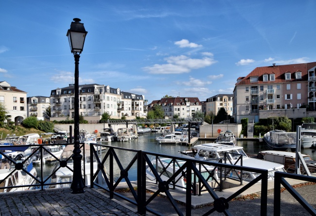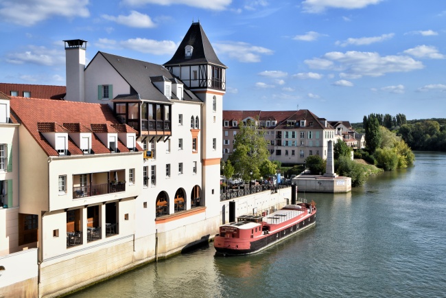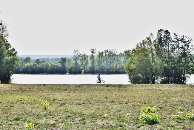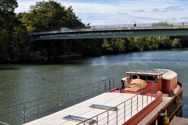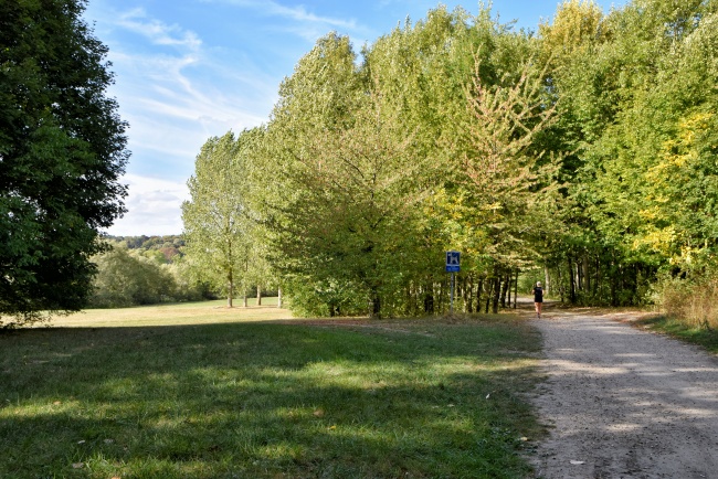 Nahoře jsme prošli velkou část trasy Axe majeure v délce téměř jednoho kilometru (zbytek do tří kilometrů tvoří vodní hladina) a zůstává poslední otázka, jak se odtud dostat zpět do Paříže. Samozřejmě je možné si celou cestu projít zpátky k vlaku, ale vzhledem ke značnému převýšení a schodům se mi do toho moc nechtělo a zvolila jsem jinou možnost. Od konce červené lávky jsem se vydala doleva podél břehu řeky směrem k říčnímu přístavu ve staré části Cergy. Procházka má něco přes kilometr a jdete v podstatě pořád buď podél vody, nebo si to v některých místech můžete zkrátit přes lesík.
